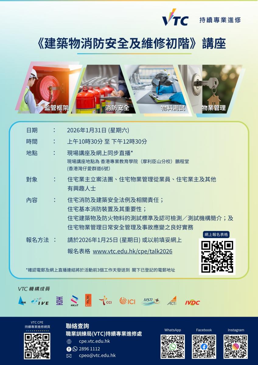 為提高住宅業主立案法團及相關持份者對住宅建築物消防安全及維修責任的認識,並支持政府在大埔事故後加強社區教育工作,職業訓練局(VTC)將於2026131日(六)舉辦免費講座,講座由VTC相關範疇專家主講。